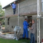 Den entscheidenden Bestandteil eines Backes - den Ofen - hatte unser 1. Vorsitzender Josef Schmitt schon 2006 gekauft. Im Internet ersteigerte er damals die Gußteile eines historischen Backofens in Potsdam. Unmittelbar in der Nähe des Hauses Loer ergab sich dann für den Geschichts- und Museumsverein die Möglichkeit des Ausbaus einer kleinen Scheune zu einem neuen Backes. Mit finanzieller Hilfe der Gemeinde und einiger Sponsoren, weitgehend aber in Eigenleistung einiger Vereinsmitglieder, konnte das Vorhaben im Jahre 2008 verwirklicht werden. Zuvor hatte der Gemeindevorstand die Bildhauerin Barbara Hillebrand mit dem Entwurf des Partnerschaftsbrunnes beauftragt, der nun ein stilvoller Bestandteil der kleinen Anlage am Backes ist.